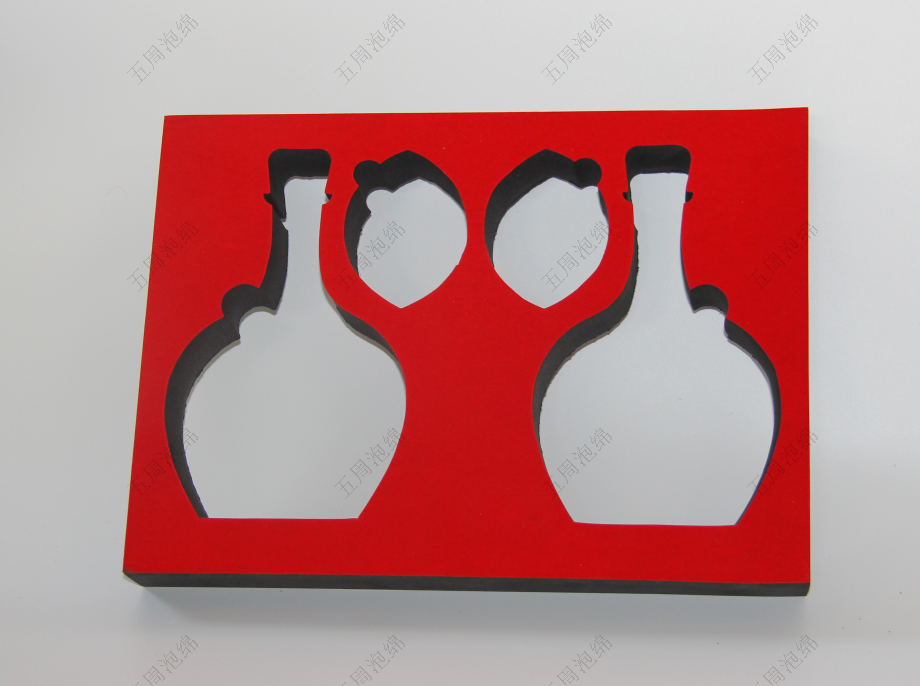 內襯的紅色基底 + 白色槽位完全貼合陶瓷瓶的輪廓 —— 五周泡棉通過 3D 掃描技術獲取瓶身的曲線結構,槽位的弧度與瓶身誤差小于 0.2mm,陶瓷瓶嵌入后被柔和包裹,避免運輸中碰撞導致的瓶身開裂;雙色設計既提升了包裝的視覺層次,又能區(qū)分不同規(guī)格的陶瓷瓶,方便分揀與展示。